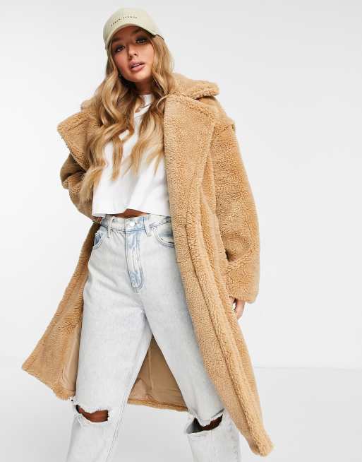 Teddyfell Mantel Mit Reissverschluss Taschen In Hellbraun Missguided