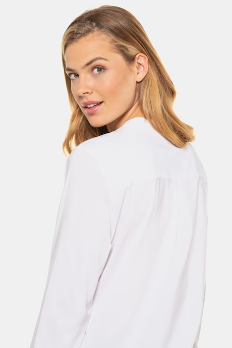 Elegantes Design—VAusschnitt Stehkragen mit verstellbarer Ärmellänge, dekorativen gekreuzte Passe am Schulter, fließend Bluse in lockere Passform, sehr elegant im Büro wie auch im Alltag;. Bluse, weiß, Stehkragen Artikelnummer Die weiße Baumwoll/Stretchbluse von MORE & MORE mit kleinem Stehkragen und Rüschenkante sieht unter Blazern, Cardigans und Pullovern gleichermaßen gut aus. Weiße Stehkragenblusen bei LadenZeilede Riesige Auswahl an neuesten Fashion Trends für jeden Anlass!.