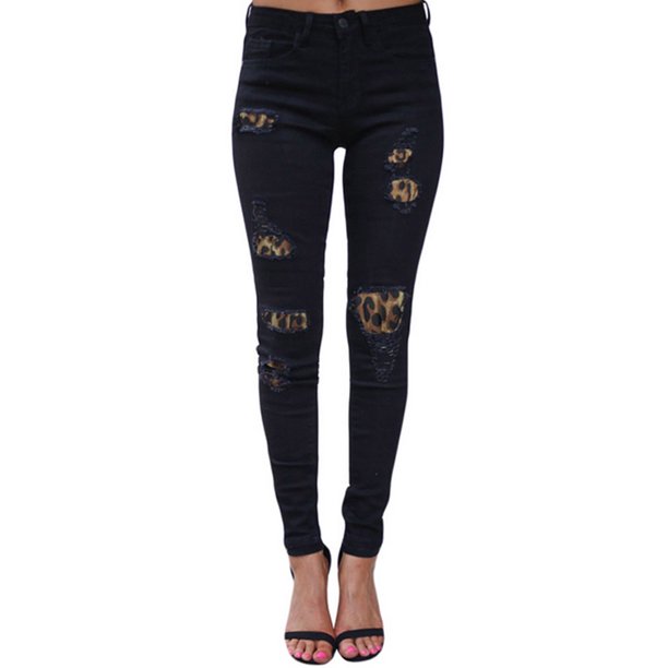Lallc Women Leopard Skinny High Waist Pants Ripped Jeans Trousers Walmart Com Walmart Com