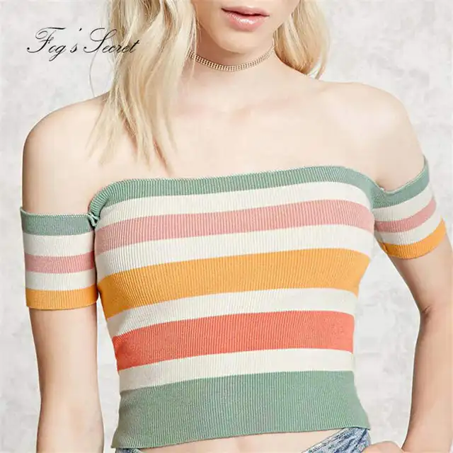 Women Sexy Tight T Shirt Clothing Short Knitted High Elasticity Rainbow Striped Slash Neck Casual Nice Tees Tops Tee Top T Shirt Woment Shirt Aliexpress