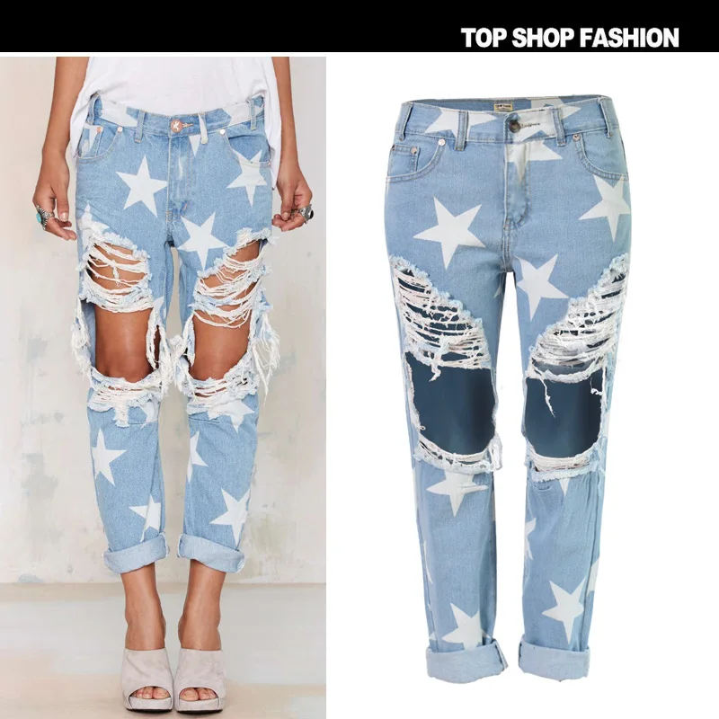 New European Women S Holes In Jeans Loose Straight Legged Nine Star Stamp Hole Pants Jeans Aliexpress
