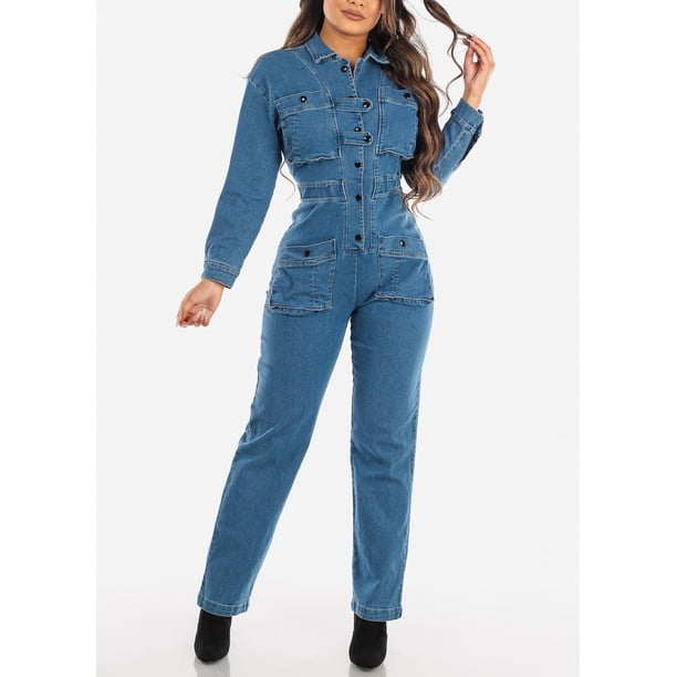 Moda Xpress Womens Long Sleeve Denim Jumpsuit Snap Closure Med Wash Boiler Jean Jumper f Walmart Com Walmart Com