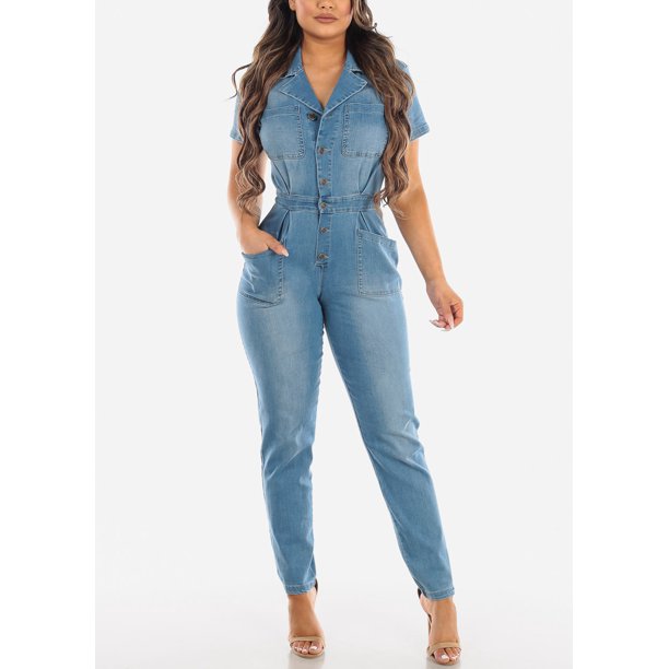 Moda Xpress Womens Short Sleeve Denim Jumpsuit Button Up With Pockets Light Wash Jean Jumper 103f Walmart Com Walmart Com