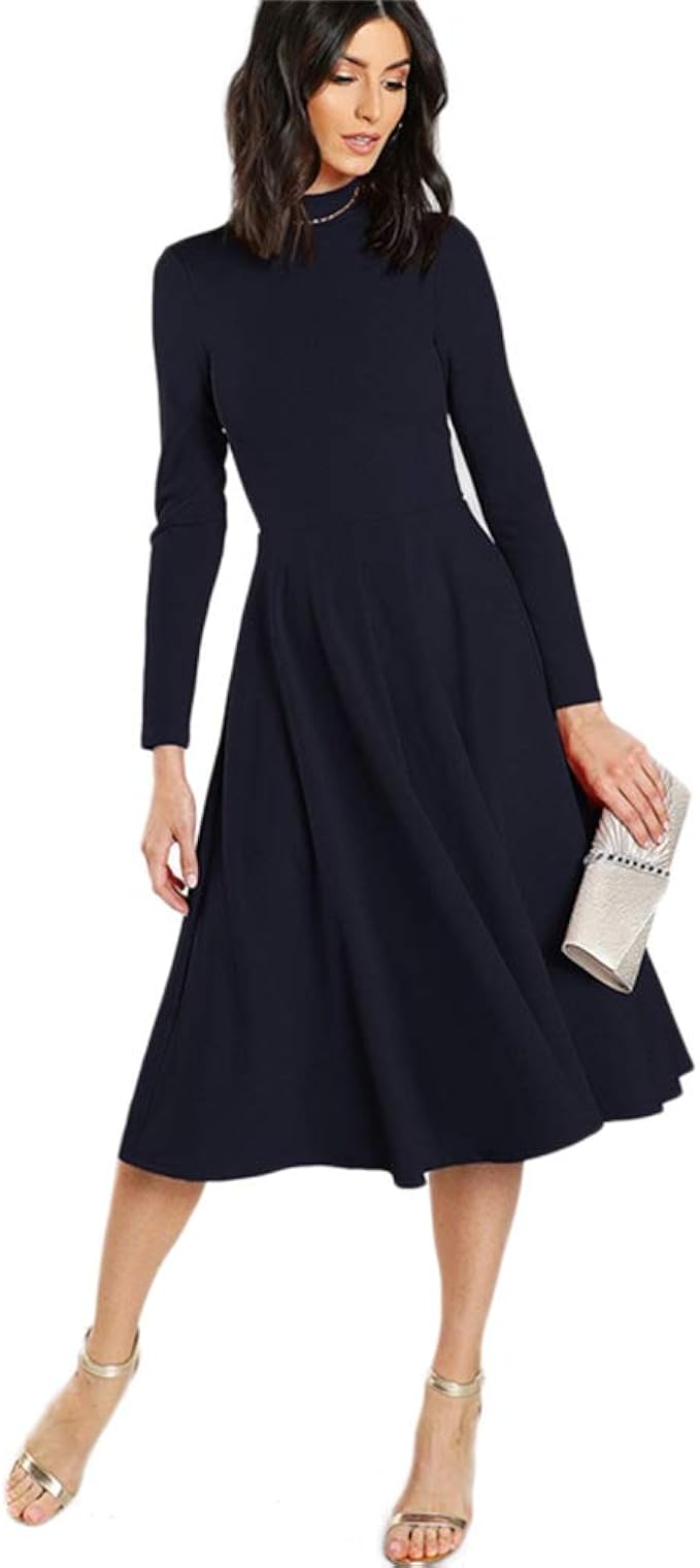 Xiguak Womens Stehkragen Ausgestelltes Business Work Kleid Langarm Hohe Taille Buro Damen Plissee Party Midi Kleid Amazon De Bekleidung