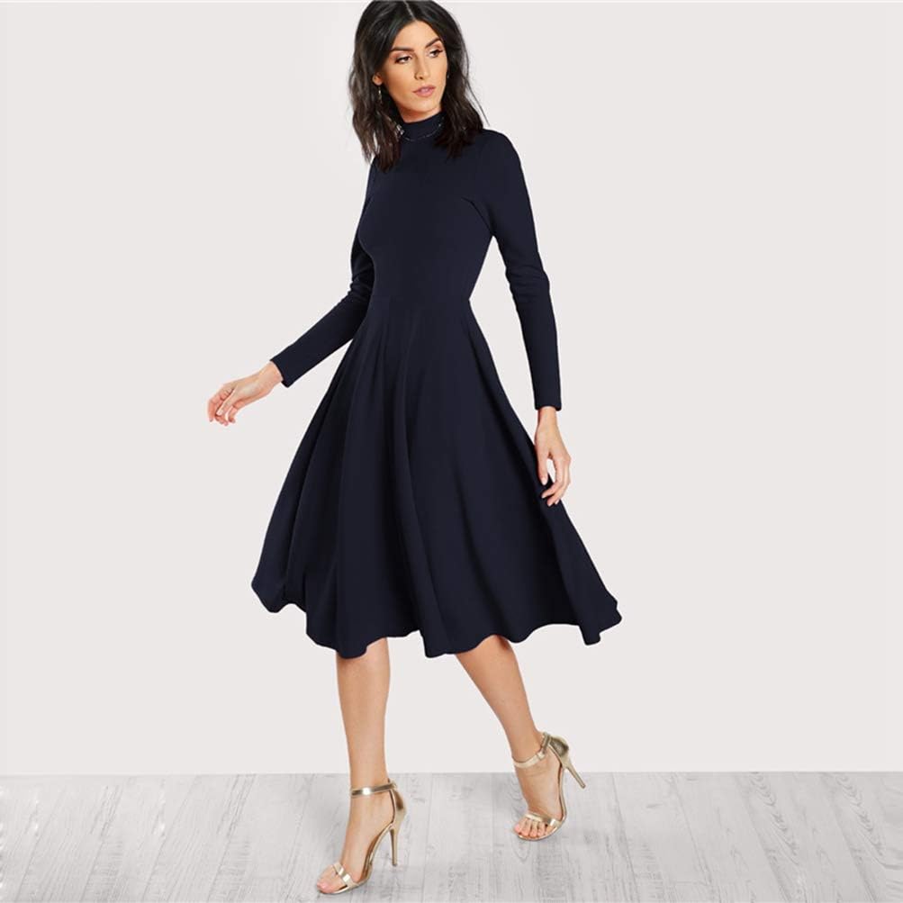 Xiguak Womens Stehkragen Ausgestelltes Business Work Kleid Langarm Hohe Taille Buro Damen Plissee Party Midi Kleid Kleider Business