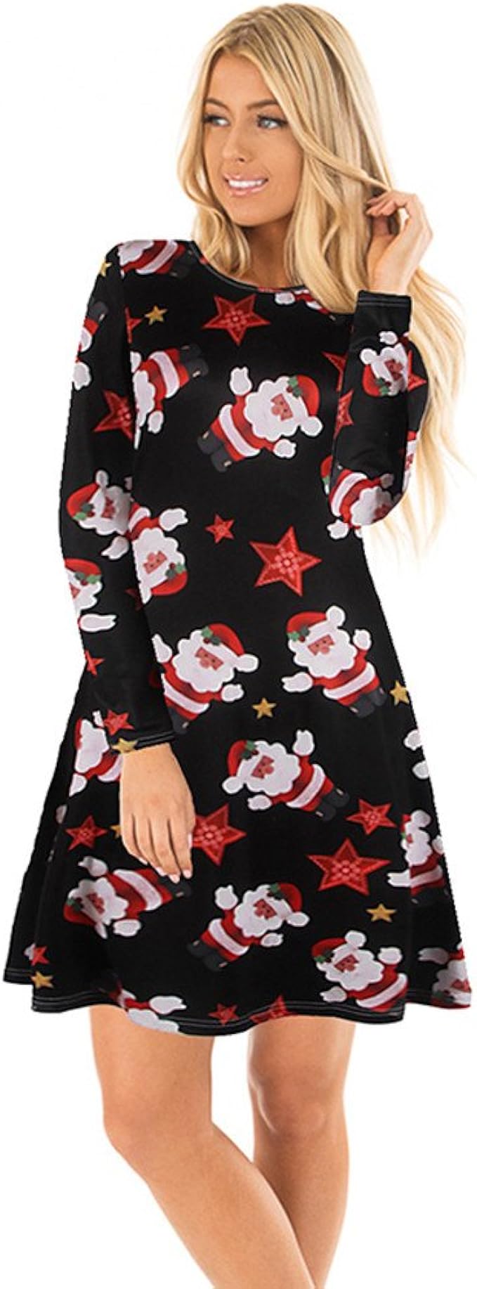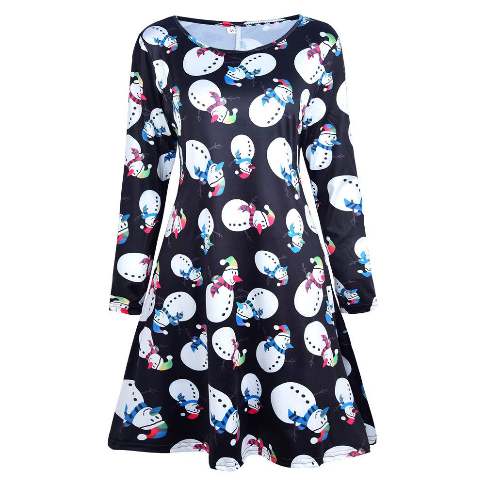 Qixuan Frauen Weihnachten Langarm A Line Kleid Gedruckt Party Ausgestelltes Swing Kleid Schwarz S