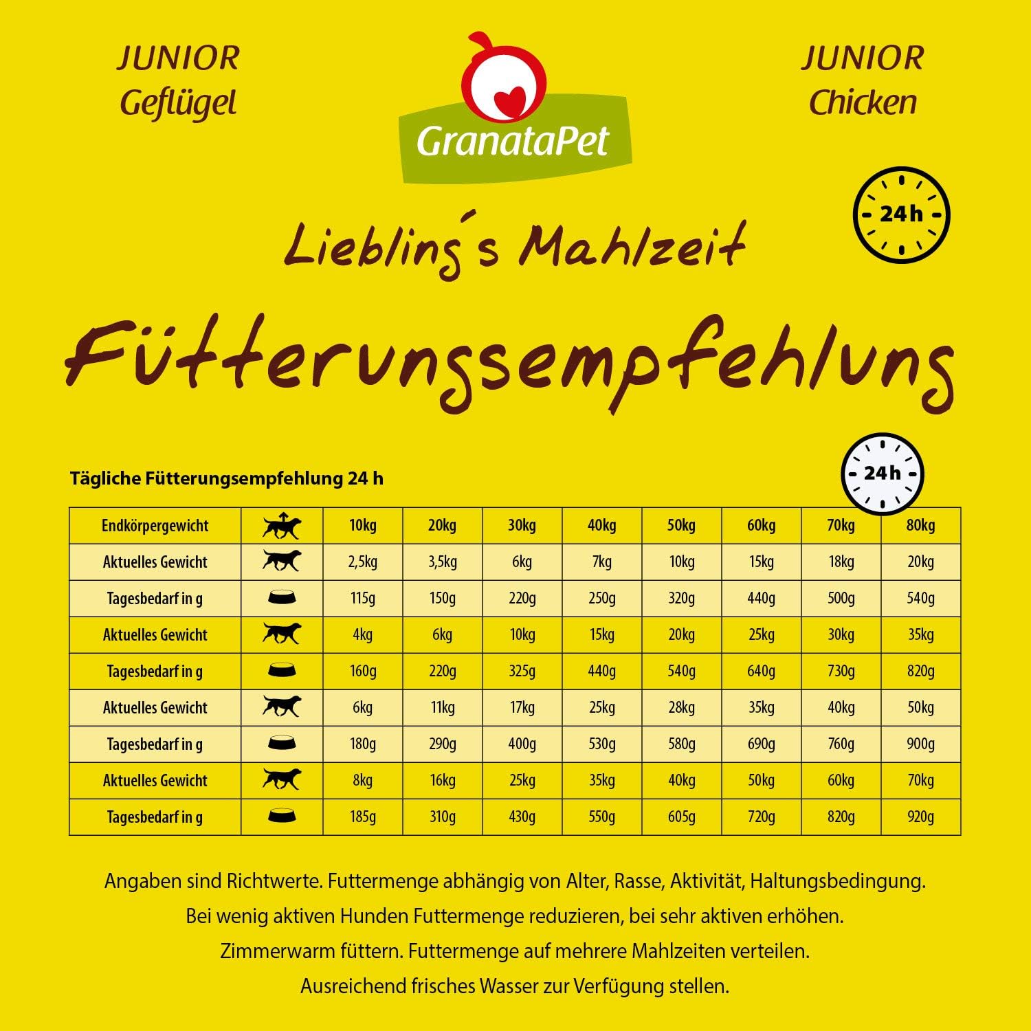 GranataPet Liebling's Mahlzeit Junior Geflügel bietet eine ausgewogene, proteinreiche und an der Natur orientierte Hundenahrung für heranwachsende Hunde bis zur Vollendung des 1 Lebensjahres Auf den Zusatz von Getreide wird bei GranataPet grundsätzlich verzichtet, da es von Hunden oft nur schwer verdaut und verwertet werden kann, und. Hund Trockenfutter Nassfutter Snacks Katze Trockenfutter Nassfutter Snacks GranataPet GranataPet Natural Taste Junior/Puppy 2 x 12 kg 1,00 € 125,98 € (500 € / 1 kg) inkl MwSt, ggf zzgl Versandkosten In den Warenkorb Weitere Varianten. Hat der Hund als Welpe bereits Trockennahrung bekommen, kann es ratsam sein, ihm auch als Junior weiterhin Trockenfutter zu geben Viele Hundehalter nehmen die JunghundPhase aber auch zum Anlass, das Futter entsprechend umzustellen, zum Beispiel auf Rohfütterung oder Nassfutter.