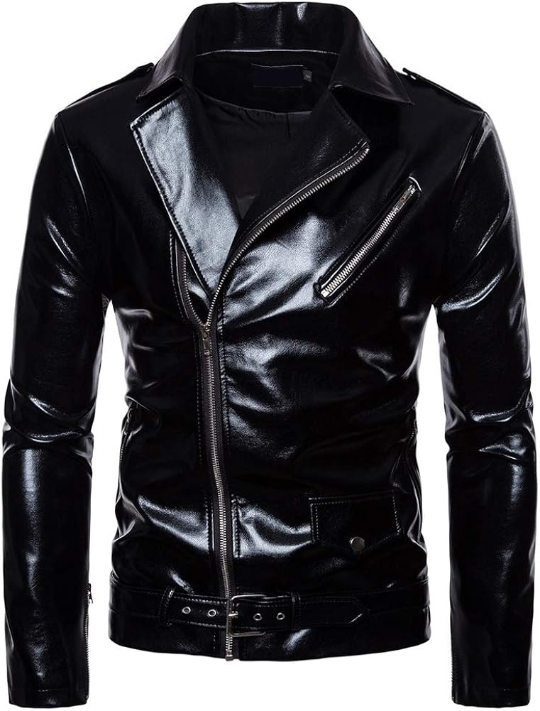 Aowofs Men S Leather Jacket Patent Look Regular Fit Faux Leather Jacket With Belt Black Xl Amazon De Bekleidung