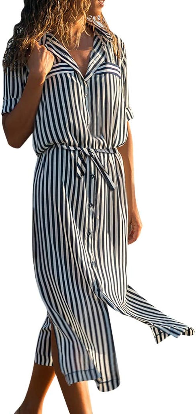 Longra Damen 1 2 Armel V Ausschnitt Elegant Sommerkleider Lang Druckkleider Blusenkleid Hemdkleid Shirt Kleid Oberteil Kleid Boho Maxikleid Mit Gurtel S 2xl Amazon De Bekleidung