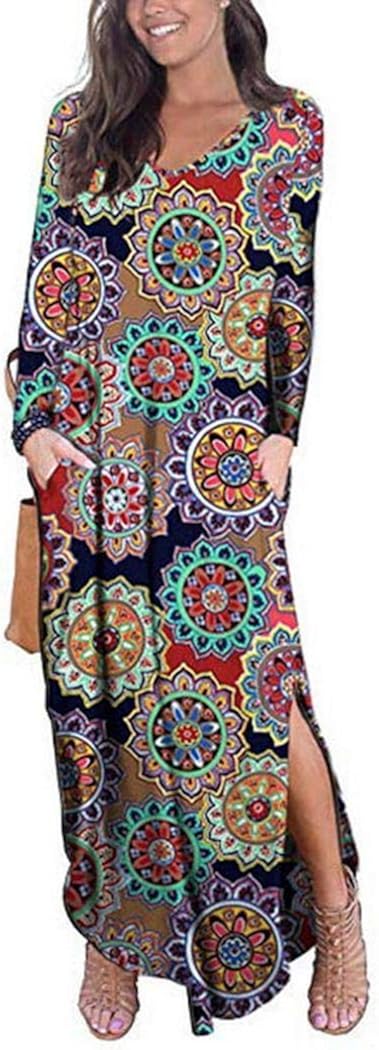 Ziyyoohy Kaftan Vintage Damen V Ausschnitt Lange Armel Ethnisch Print Maxikleid Strandkleider Sommerkleider Amazon De Bekleidung