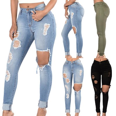 Damen Ripped Destroyed Jeans Skinny Slim Denim Pants High Waist Stretch Trousers Ebay