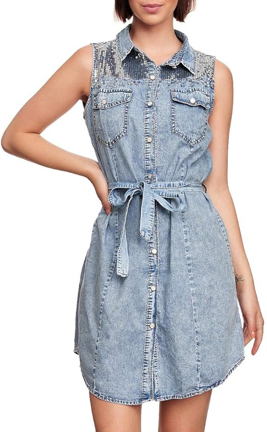 Egomaxx Damen Denim Jeans Kleid Armellos Slim Jeansbluse Pailletten Bindegurtel Amazon De Bekleidung