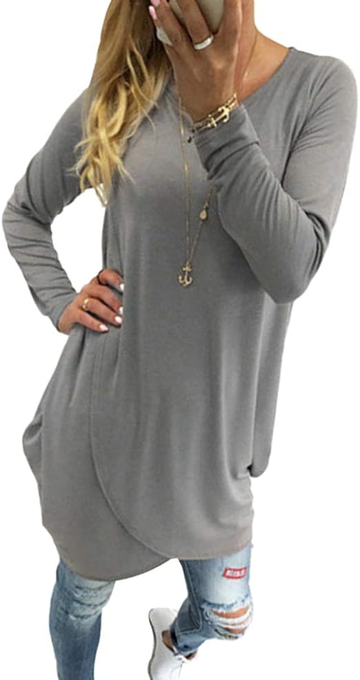 Fruhling Herbst Damen Irregular Pulli Kleid Freizeit Locker Lang Pullover Oberteile Tuniken Jumper Blouse Mode Rundhals Langarm Sweater Kurz Kleider Blusenkleid