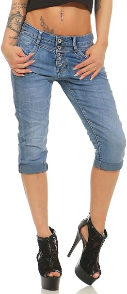 Moderne Damen Capri Jeans Hose Aufgesetzte Knopfleiste Crash Denim Boyfriend Style Blue Washed Pc8159 Amazon De Bekleidung