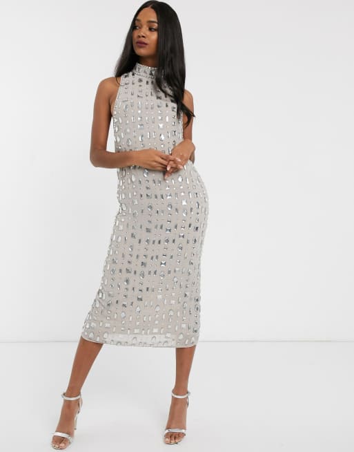Asos Design Wadenlanges Kleid Mit Schmucksteinverzierung In Linearer Optik Asos