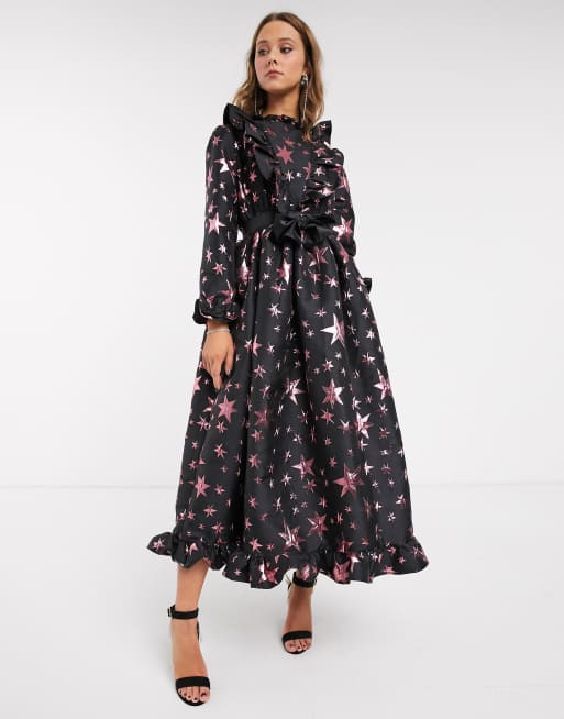 Sister Jane Vorn Gerafftes Wadenlanges Kleid Mit Bauschigem Rock Und Jacquard Sterndesign Asos