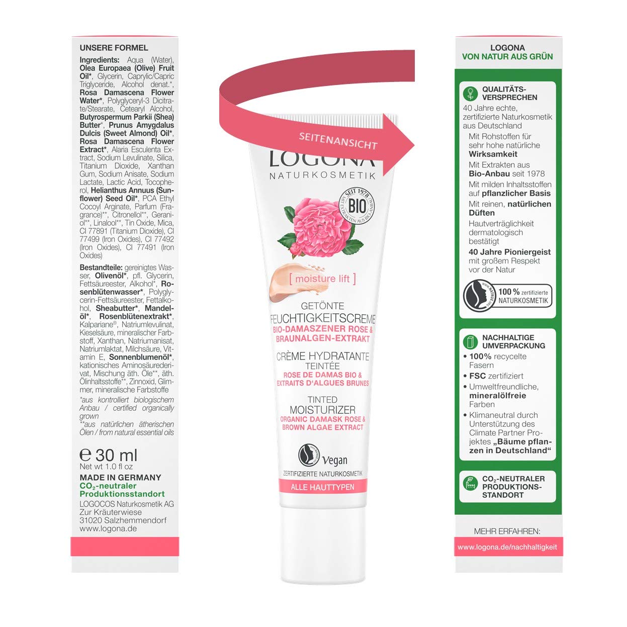 Alverde Naturkosmetik Getönte Feuchtigkeitscreme Inhaltsstoffe / Alverde Naturkosmetik Getönte Feuchtigkeitscreme Ingredients AQUA, ALCOHOL, GLYCERIN, GLYCINE SOJA OIL, TALC, CI 771, GLYCERYL STEARATE CITRATE, BUTYROSPERMUM PARKII BUTTER, MYRISTYL MYRISTATE, CETEARYL ALCOHOL, PRUNUS AMYGDALUS DULCIS OIL, PRUNUS ARMENIACA KERNEL OIL, SIMMONDSIA CHINENSIS SEED OIL, CALENDULA OFFICINALIS. Living Nature Tinted Moisturiser Day Light Getönte Feuchtigkeitscreme Living Nature Getönte Feuchtigkeitscreme ist eine leichte espflege mit Mineralpigmenten, um dem Hautbild eine sanfte Gleichmäßigkeit zu verleihen Die Deckkraft ist nicht so stark wie die der Living Nature Foundations Wenn die Zeit zum Schminken fehlt!. LOGONA Naturkosmetik Getönte Feuchtigkeitscreme BioDamaszener Rose & Kalpariane, Vegan, Hautton anpassende GesichtsCreme, 30ml Die leichte, vegane Formel mit mineralischen Farbpigmenten passt sich dem natürlichen Hautton an und gleicht kleine Unregelmäßigkeiten sanft aus Für einen strahlenden, ebenmäßigen Teint.