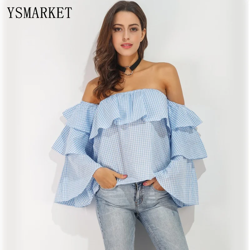 New Girls Blue Plaid Casual Off Shoulder Shirt Ruffle Loose Butterfly Sleeves Tops Female T Shirts Women Harajuku Tshirt H Harajuku Tshirt Female T Shirtt Shirt Women Aliexpress