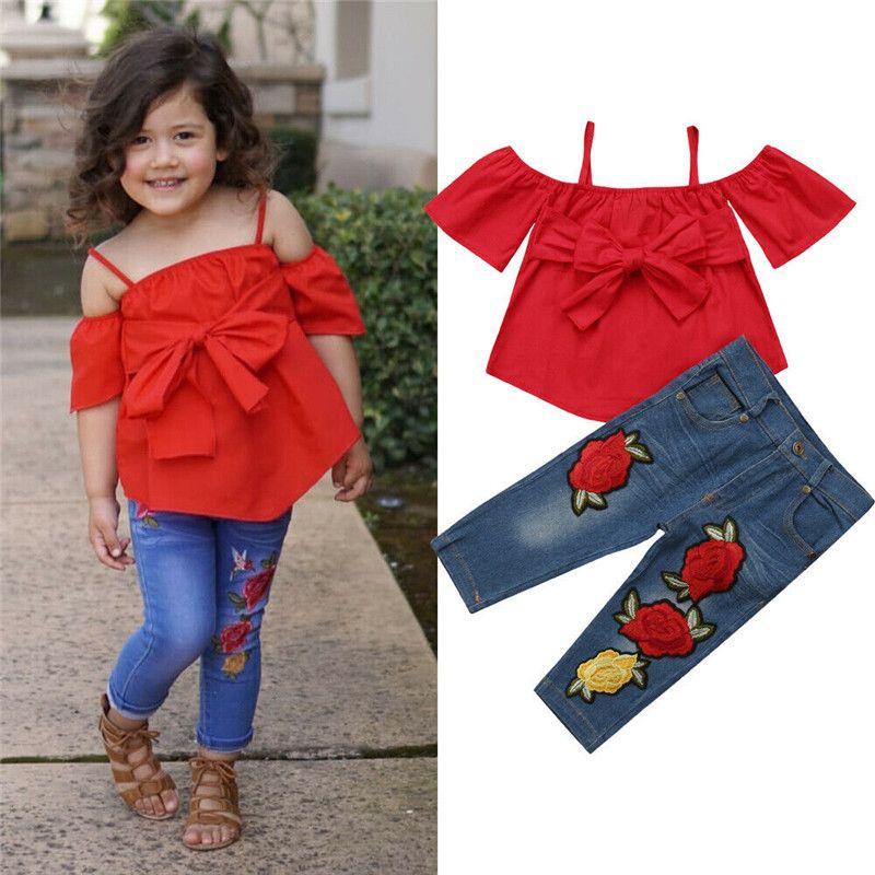 Fashion Children Kids Girls Embroidered Clothes Red Off Shoulder Blouse Tops Flower Denim Pant Set Kids Clothes 1 6years From Changchuncc 19 1 Dhgate Com