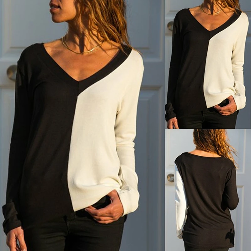 Nieuwe Mode Lange Mouw T Shirt Vrouwen Casual Losse Tops Tee Shirt Femme Patchwork Sexy V Hals Vrouwelijke T Shirts Kantoor Muje T Shirts Aliexpress