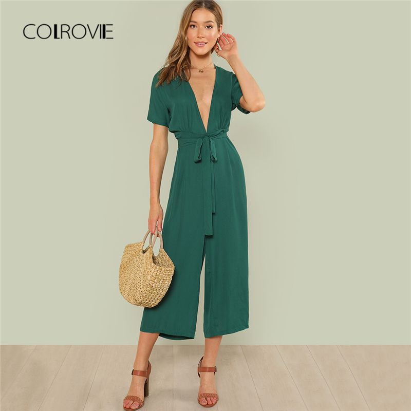 Grosshandel Colrovie Plunge Neck Gurtel Culotte Jumpsuit Frauen Grun Tiefem V Ausschnitt Sexy Jumpsuit 18 Neue Kurzarm Knoten Sommer Von Worsted 19 72 Auf De Dhgate Com Dhgate