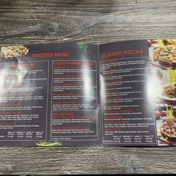 Menu Appetizers Twisted Garlic Bread $8 Our signature fresh made garlic bread coated with butter and parmesan cheese Twisted Jalapeno Poppers $10. Menu 2459,118,13,47 Twisted. Pizza Twist Popular Items Appetizers/Sides Soups/Salads Pasta Vegan Pizza Twist Paneer Pizza Twist Chicken Pizza Twist Halal Pizza Twist Twisted Chicken Traditional Pizza RED SAUCE, CHEESE, HAM, PINEAPPLE RED SAUCE, CHEESE, PEPPERONI, HAM, MUSHROOMS, ONIONS, BLACK OLIVES,.