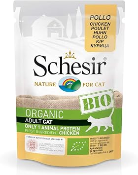 Schesir Katzenfutter in Dosen mit Huhn, Rind mit Reis 85 g (Geschmack Rindfleisch & Huhn & Reis ArtNr ) günstig online bestellen Lieferung bis zur Haustür Beste Qualität. Schesir Cat Bio Monoprotein Huhn, Katzenfutter nass, 16 Beutel x 85 g Schesir Cat Bio Monoprotein Huhn ist ein hochwertiges ÖkoNassfutter für ausgewachsene Katzen aller Rassen auf Basis von BioFleisch, das durch leckere, natürliche Zutaten ergänzt wird. Immer natürlich, jetzt auch BIO BIO Huhn SCHESIR BIO, WET LINE FÜR ERWACHSENE KATZEN –Vollständige und ausgewogene Lebensmittel –Kontrolliert und zertifiziert als biologisch von der CCPB, einer unabhängigen Organisation, die vom Ministero della Politiche Agricole, Alimentari e Forestali, autorisiert wurde.