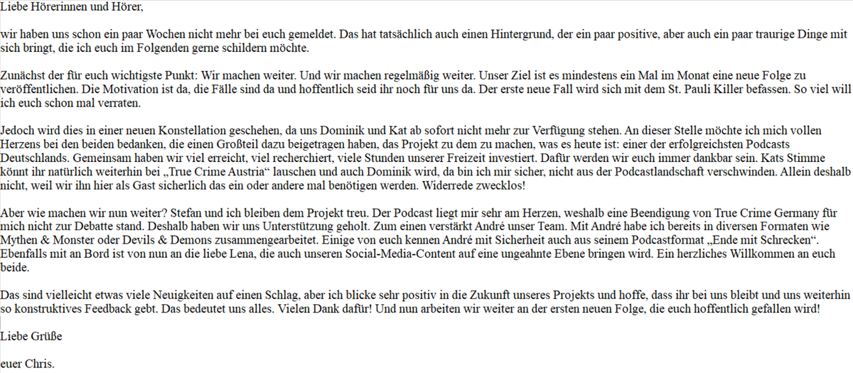 True Crime Germany Liebe Horerinnen Und Horer Ihr Habt Schon Eine Weile Nichts Mehr Von Uns Gehort Das Hat Grunde Deshalb In Der Folge Ein Langerer Post Uber Abschiede Neuzugange