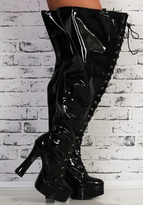 Lack Weitschaft Schwarz Overkneestiefel Schnurung Stiletto