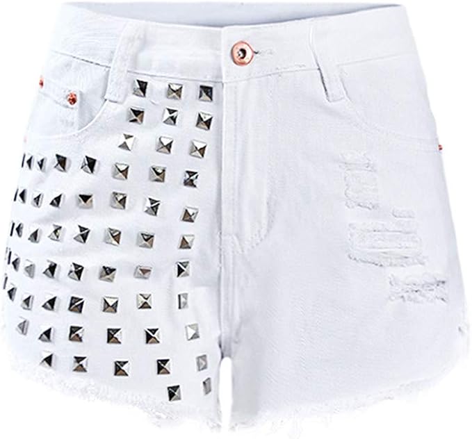 Weisse Shorts Mit Punk Metal Nieten Verzierte Mid High Waist Ripped Short Jeans Shorts Amazon De Bekleidung