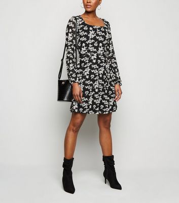 Blue Vanilla Schwarzes Kleid Mit Blumenmuster Und Karree Ausschnitt New Look