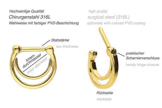 Septum Piercing Ring Schnelle. NO PIERCING REQUIRED Fake Septum Ring Comfortable & Lightweight Design Easy To Open & Squeeze Into Place Please choose MATERIAL ★100% 14K gold filled ★ ★100% Silver Sterling ★ Please choose GAUGE Gauge the thickness of the wire gauge 08 mm (standart thick) 22 gauge 06 mm (standart thin) 24 gauge 05 mm (very thin. They are easy to put in your piercing and look great We have steel, titanium, gold, plated and more.
