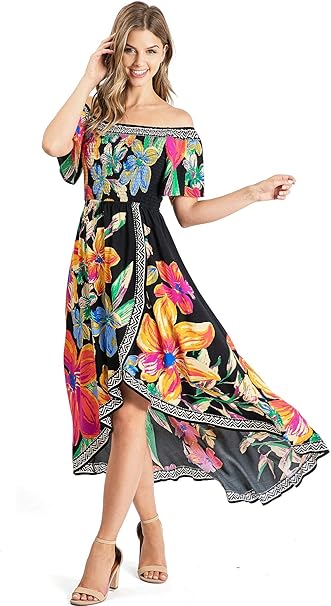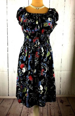 Flying Tomato Jealous Tomato Damen Junior Tropisches Blumenmuster Schulterfrei Gesmoktes Kleid Schwarz Mittel Amazon De Bekleidung