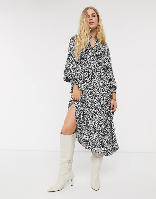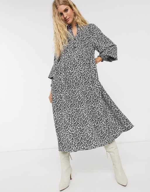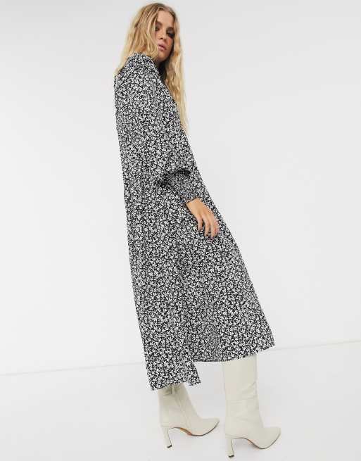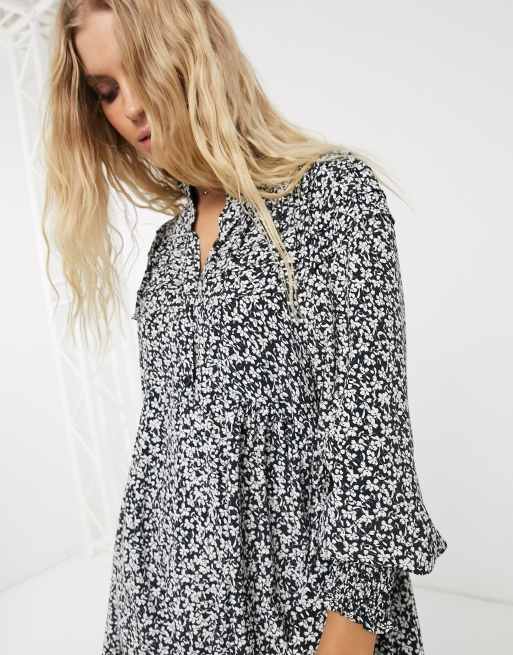 Gesmoktes Kleid Mit Trompetenarmeln Schlusselloch Ausschnitt Und Blumenmuster In Schwarz Missguided