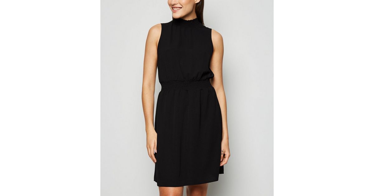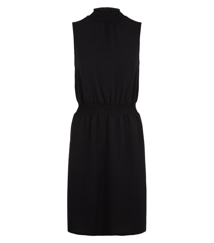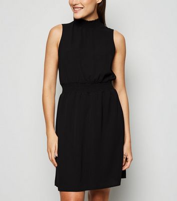 Gesmoktes Kleid In Schwarz Mit Stehkragen New Look