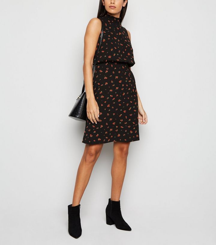 Schwarzes Gesmoktes Kleid Mit Stehkragen Und Rosenmotiv New Look