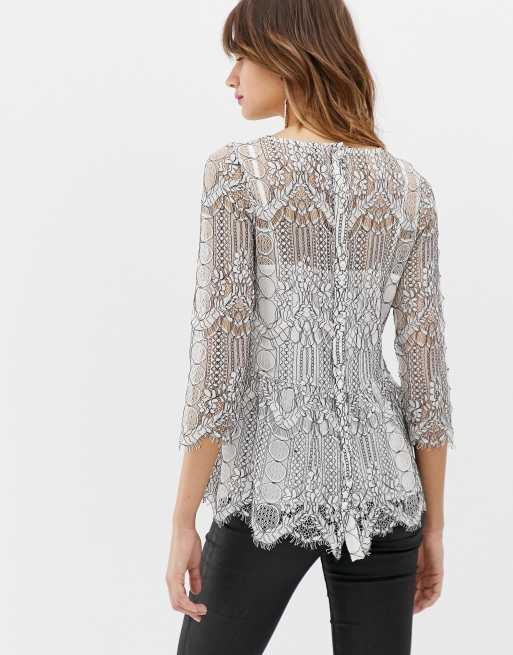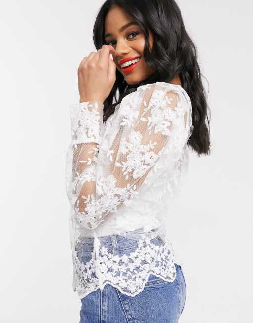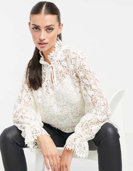 Lipsy Weisse Spitzenbluse Mit Puffarmeln Und Schnurung Am Ausschnitt Asos