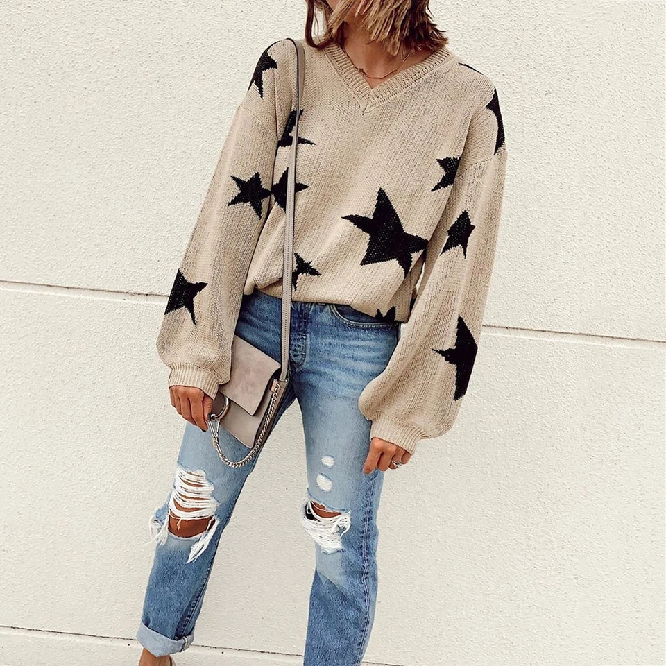 Autumn Fashion V Neck Star Sweater Women Lantern Sleeve Knitted Oversized Pullover Sweaters Casual Jumper Tops Winter Clothes Pullovers Aliexpress