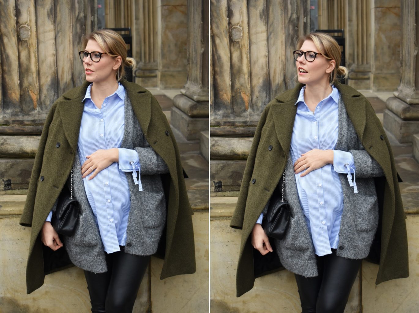 Schwangerschaftsmode Lederhose Streifenbluse Oversized Cardigan Oh Wunderbar Blog Family Fashion Lifestyle Travel
