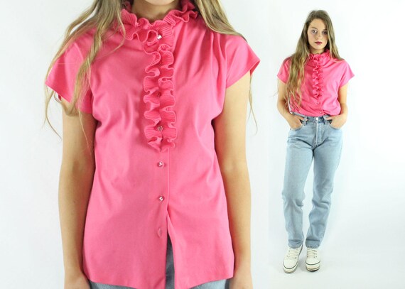 70er Jahre Rosa Tuxedo Bluse Kurzarm Shirt Ruschen Top Etsy
