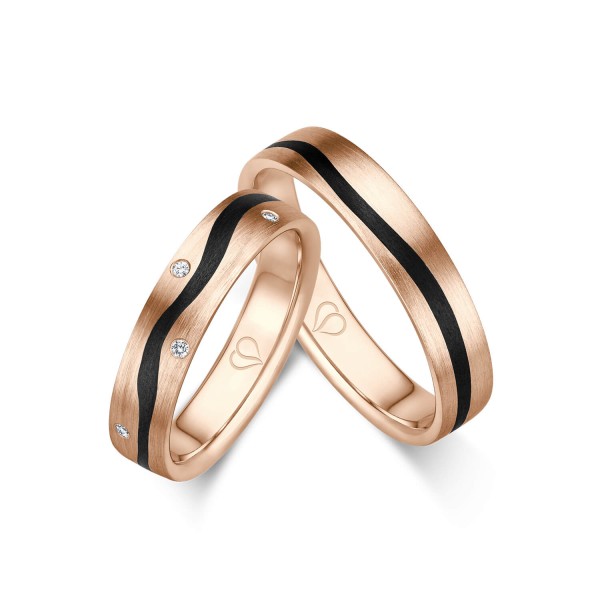Hier befinden sich als weiterer spezieller Blickfang auf dem Damenring fünf strahlende Brillanten mit 0,034 ct TWsi Die wertvollen Edelsteine sitzen dicht hintereinander und passen sich der Woge an Fein gemasertes Carbon umschließt die Welle An den äußeren Rändern der Ringe bilden die schmalen Streifen aus Rotgold den schönen Abschluss. Kostenloses Poliertuch auf Wunsch;. Warum Trauringe und Eheringe aus Roségold?.