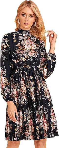 Cool Angashion Womens Dresses Casual Floral Print Long Sleeve Swing Pleated Skater A Line Mi Casual Dresses For Women Long Sleeve Dress Long Sleeve Print Dress