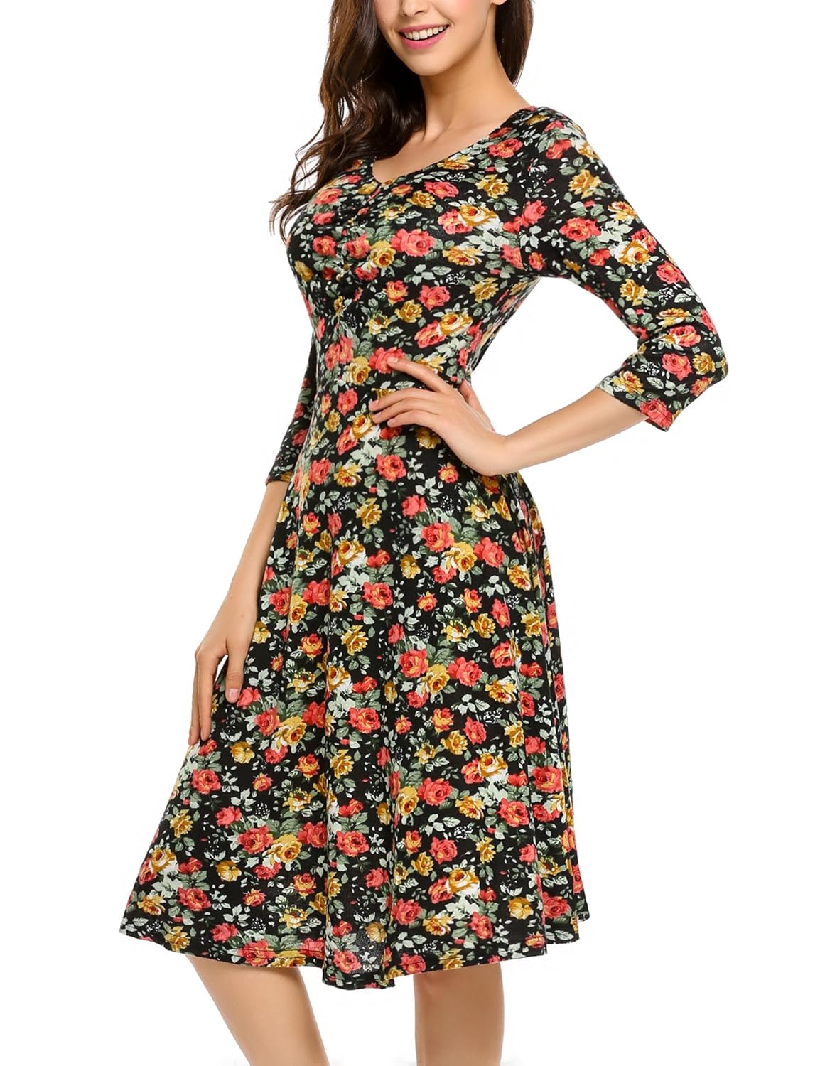 Beyove Damen Langarm Blumenkleid Swing Rockabilly A Linie Kleid Knielang Freizeitkleid Skaterkleid Partykleid Winterkleid Herbst Kleider Abendkleider