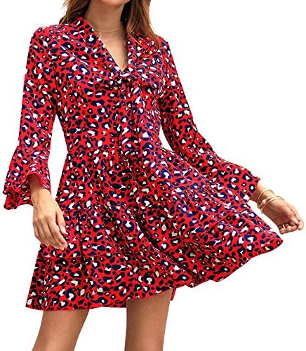 Ztoma Leoparden Kleid Damen Einteilig Kleid Leopardenmuster Kurzarmlig V Ausschnitt Kleid Rot Large Amazon De Kuche Haushalt