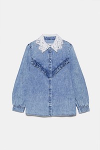 Zara Bluse Hemd Jeans Denim Spitze Kragen Gr L 38 40 Maran Blau Weiss Ruschen Ebay