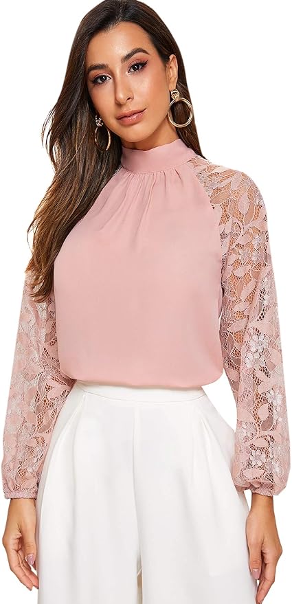 Romwe Damen Langarm Bluse Mit Spitze Und Schleife Amazon De Bekleidung