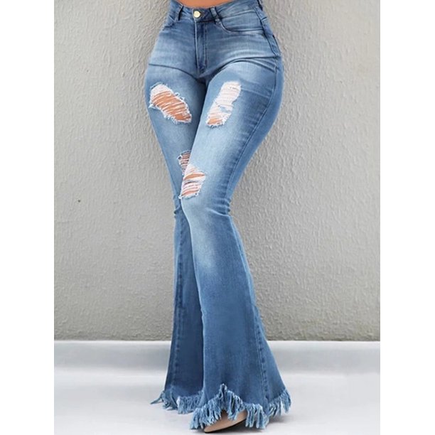 Sexy Dance Women High Waist Jeans Distressed Ripped Tassel Denim Pants Trousers Casual Bodycon Flared Bell Bottom Long Pants Ladies Juniors Bell Bottom High Rise Fitted Denim Jeans Walmart Com