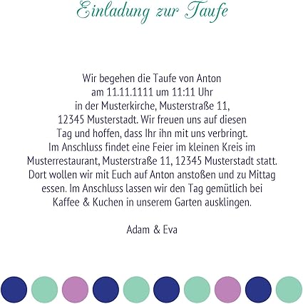 Bleibe ganz schlicht bei den erwähnten Details oder füge eine persönliche Note, z B eine Nachricht an deine Gäste, hinzu. Hamm Dir gefallen unsere Videos und du möchtest uns unte. Exemplarische Einladungen zur Taufe – Hilfreiche Muster & Vorlagen Damit Sie einen genaueren Eindruck erhalten, wie eine fertige Einladung zur Taufe aussehen sollte, stellen wir Ihnen zwei exemplarische und optimal ausformulierte Karten zur Ansicht zur Verfügung Unsere beiden Vorlagen bzw.