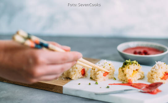 Klassischer Milchreis wird hier mit frischen Früchten gepimpt, gerollt und in Schokolade gedippt Try it!. Süßes Sushi mit Milchreis, Erdbeeren und PistazienPesto Vorbereiten 60 Min Zubereiten 30 Min Niveau Mittel Zutaten für 2 Rollen Für das Sushi 1 l Milch, zimmerwarm;. Die Konsistenz sollte etwas fester sein, als beim herkömmlichen Milchreis Den Reis dann vom Herd nehmen und die Masse gut auskühlen lassen Den Reis nach dem Auskühlen in kleineren Portionen auf Frischaltefolie geben Für "normale" Sushi den Reis fest mit Frischhaltefolie umwickeln, sodass eine Rolle entsteht.