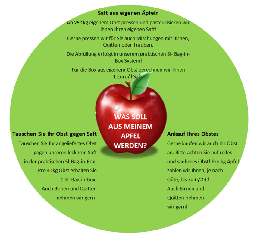 Dann kommen wir nur zu Dir und pressen nur dein Obst Du kannst uns einen Stellplatz anbieten, hast aber nur eine kleinere Menge als 1500 Kilo Dann kommen wir bei Dir vorbei und bestellen noch weitere Kund*innen dazu Aus Obst wird Saft oder Wie aus Obst Saft wird. Dann kommen wir nur zu Dir und pressen nur dein Obst Du kannst uns einen Stellplatz anbieten, hast aber nur eine kleinere Menge als 1500 Kilo Dann kommen wir bei Dir vorbei und bestellen noch weitere Kund*innen dazu Aus Obst wird Saft oder Wie aus Obst Saft wird. Und füllen den süßen haltbaren Saft ab in die praktischen Bag in Box;.